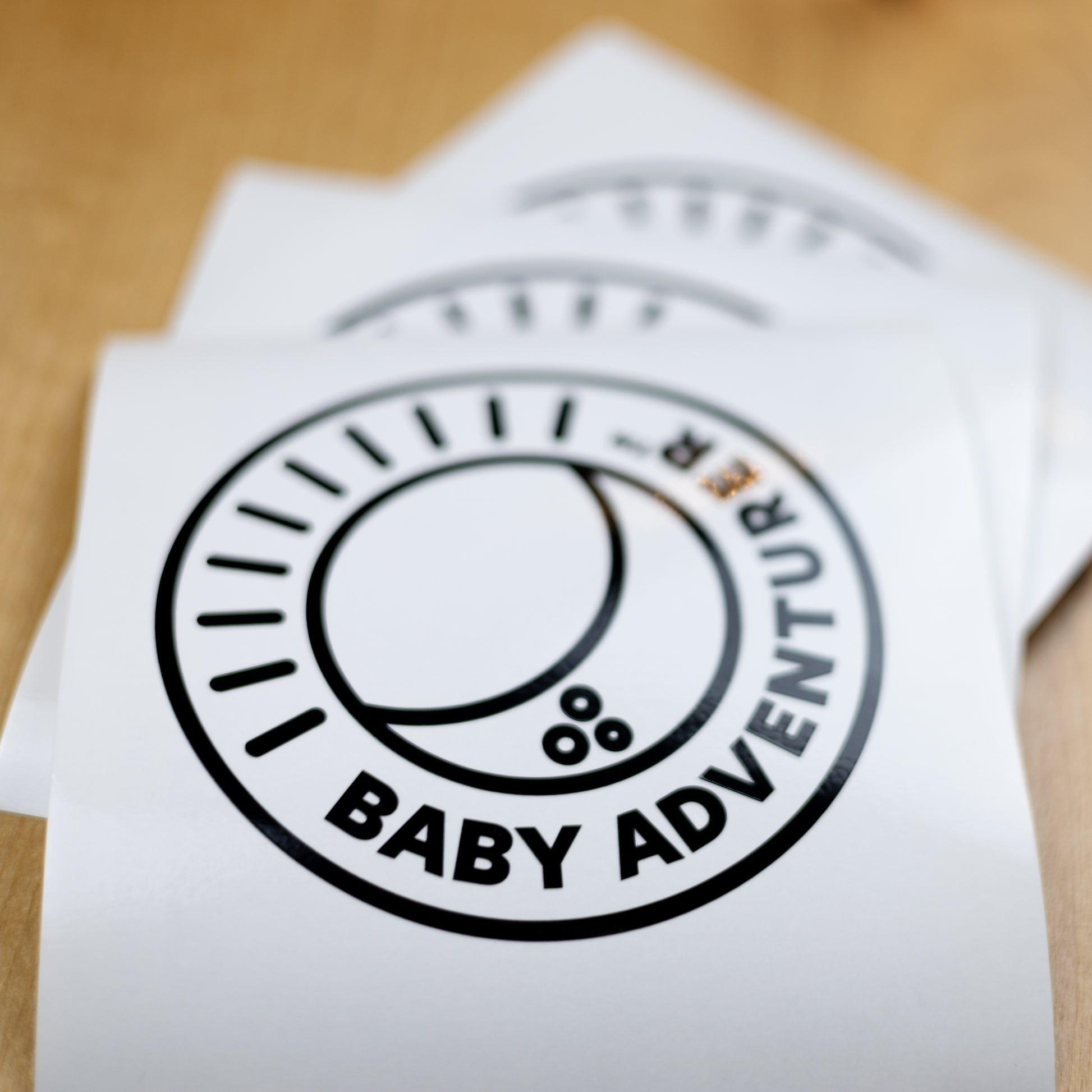 Bring a bit of adventure to your stroller with the Baby Adventurer™ Decal! The black reflective logo will look daringly cool while keeping your "little explorer" safe and stylish!